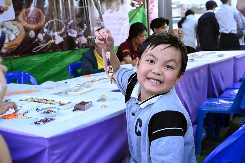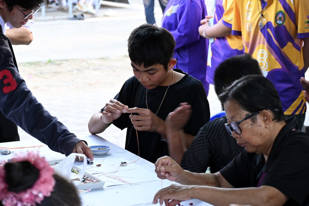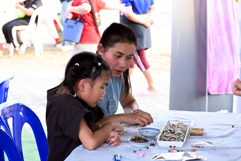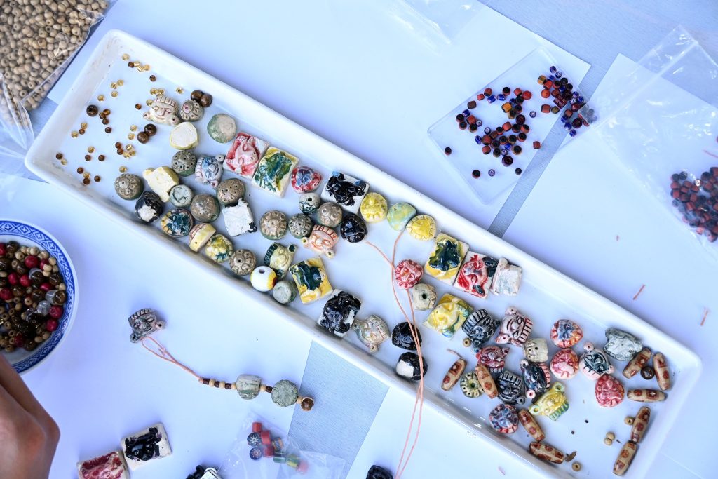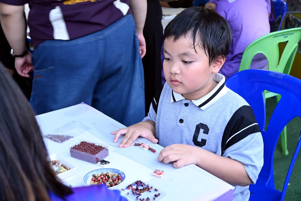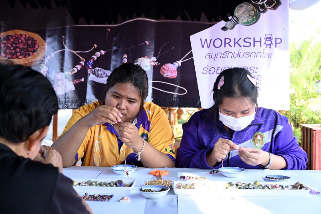 ซึ่งกิจกรรมนี้ได้รับความสนใจเป็นอย่างดีทีเดียวค่ะ ไม่ว่าจะเป็นน้องๆ นักเรียน นักศึกษาที่มากันเป็นกลุ่ม คุณพ่อคุณแม่ที่พาลูกมานั่งร้อยลูกปัดกันเพลินๆ ได้ฝึกสมาธิ และความคิดสร้างสรรค์ ที่สำคัญกิจรรมนี้ยังได้แทรกเรื่องราวของลูกปัดอัตลักษณ์ของศรีเทพเมืองมรดกโลกให้ทุกคนได้รู้จักมายิ่งขึ้นด้วยค่ะ